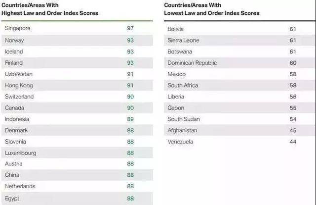 其中,以低犯罪率著称的新加坡得分为97,排名第1。