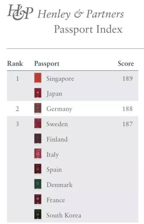 近日,全球居留和公民身份规划机构Henley& Partners更新了最新护照“含金量”排名,它是以各国各地护照免签的国家和地区数量多少作为指标。