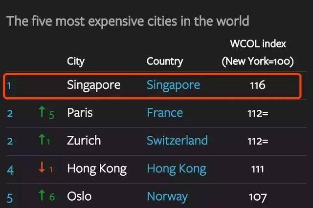 全球生活成本Top 1近期英国经济学人智库发布的《2018 年全球生活成本报告》中,新加坡已连续第5年被评为全球物价最高的城市。