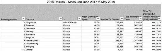 全球宽带网速Top 1 广告今年英国 Cable.co.uk 网站公布全球 200 个国家宽带网络下载速度排名榜,新加坡以平均下载速度为 60.39 Mbps 的网速夺得冠军,相当于下载一部 5GB 的高清电影仅需要 11 分钟,这网速太给力了!