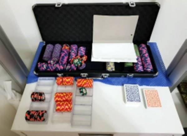 警方在扫荡行动中起获一箱的筹码以及扑克牌。(警方提供)