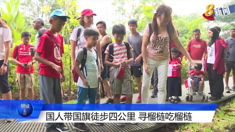 国人以不同方式欢庆国庆,一组国人带着国旗步行四公里,探索本地自然生态的同时,也找寻名为新加坡榴梿的本地品种榴梿树。
