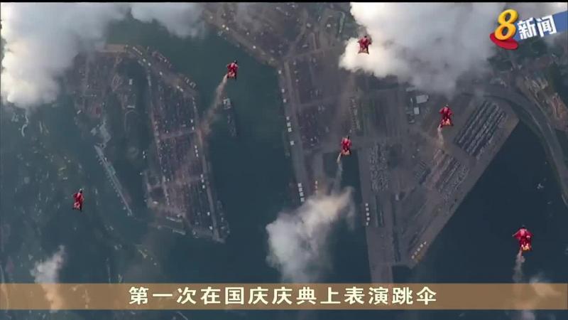 今年庆典一大亮点,是八名海军战斗潜水员从6000尺的高空一跃而下。他们从高空跳下,分别降落在水中的指定区域,这是海军战斗潜水员第一次在国庆庆典上表演跳伞。