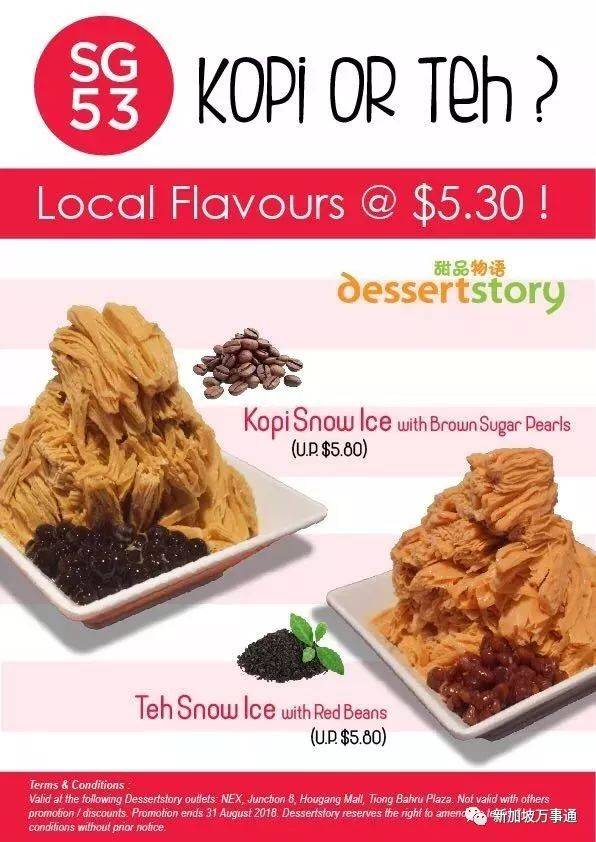 甜品连锁店 Dessert Story推出两款国庆特别版-棕糖珍珠咖啡雪冰和红豆奶茶雪冰。售价统一S$5.3。