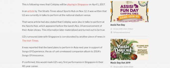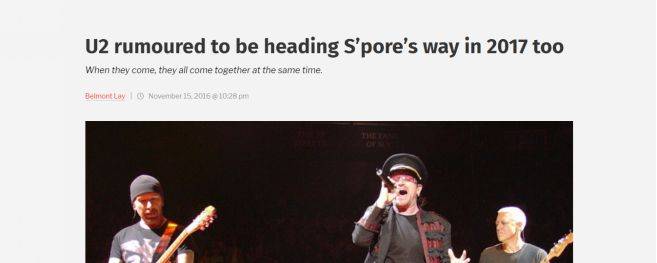 关于U2要来新加坡巡演的消息,其实早在2016年11月就有相关的传闻了。在Coldplay公布了2017年亚洲巡演场次的日期后,新加坡本地网络媒体Mothership透露了内部知情人士的传言称U2将在2017年年底将《Experience + Innocence》巡演带到大洋洲和亚洲等国家;并且正与新加坡体育城探讨预定国家体育场场馆作为该巡演的其中场次之一。