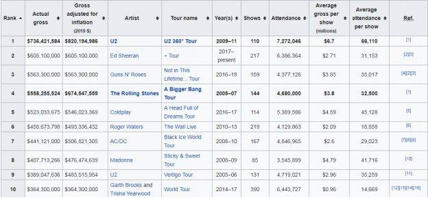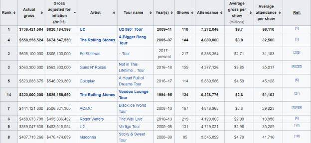史上10大票房最高的巡演记录(经过通胀调整)