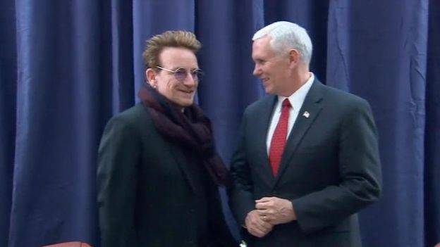 Bono在德国慕尼黑与美国现任副总统麦克彭斯会面交谈(2017年)