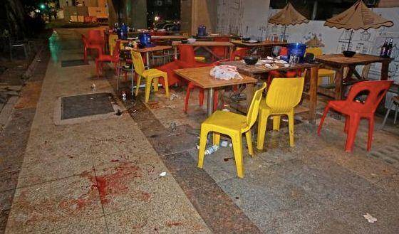 “他们那桌坐了四男一女,其中有纹身的男子突然站起身攻击红衣男子,对方也不甘示弱地飞腿反击。”他表示,两人之后互丢桌上的至少10个酒瓶与酒杯,纹身男相信是被玻璃碎片割伤,满头满身是血。据了解,送院的纹身男头部受伤。“食阁已打烊,只有我们两桌人在那里,而现场犹如电影中的打斗画面,我们吓得急忙跑到一旁,以免被波及。”