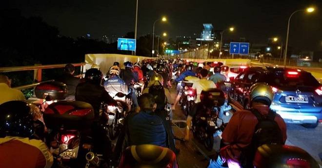 大马客工骑乘摩哆准备从新加坡离境时,因交通阻塞而动弹不得。图取自面子书