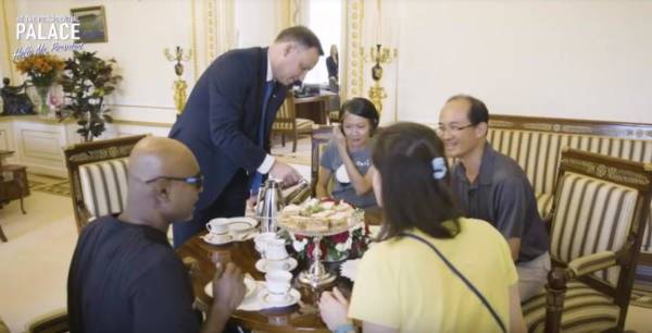 视频显示,杜达步出总统府,与4名旅客握手致意后,再带领他们参观总统府,最后更向旅客介绍自己的办公室,并大方邀请他们坐在办公室内喝下午茶。
