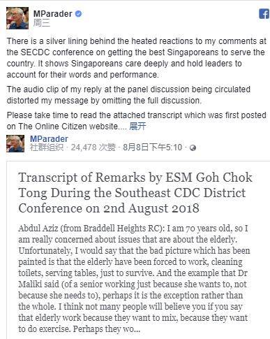 舆论雪球越滚越大,在国庆前夕晚,吴资政终于在面簿上发文澄清说,谈话被曲解了,新加坡人不论工资多少,都不是平庸。