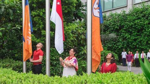 8月8日,新加坡全国300多名教职员工、工作人员、学生和校友身着红白相间衣服聚集在NUS的大学礼堂,参加年度国庆日仪式。