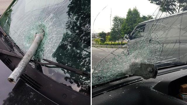 司机Rasyid Epvmc在Facebook分享,星期二(7日)在淡滨尼快速公路往榜鹅方向,以每小时70公里的速度行驶时,一根铁棒突然从车外飞来,直接插入轿车的挡风玻璃。