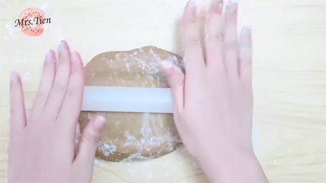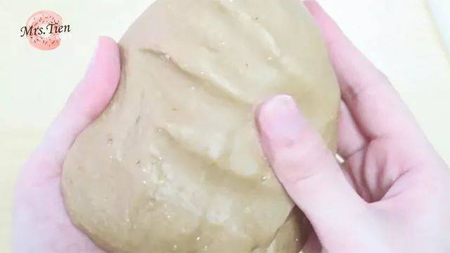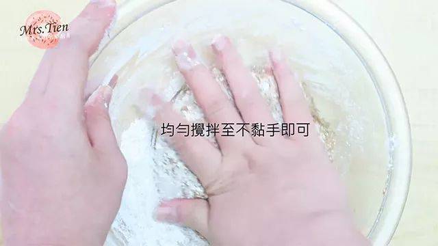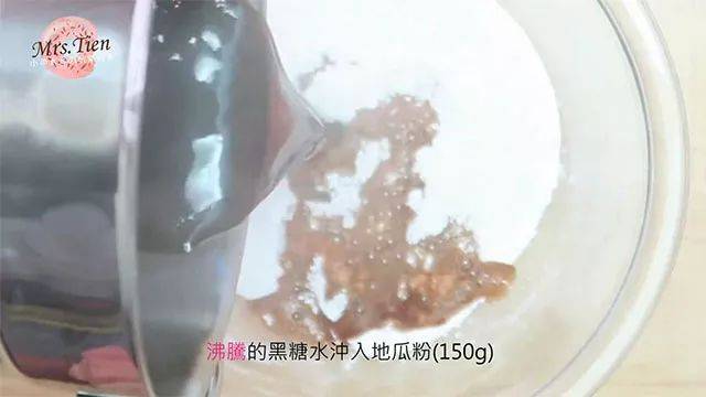 将之前煮滚的黑糖水倒入番薯粉中。均匀搅拌直到不粘手。