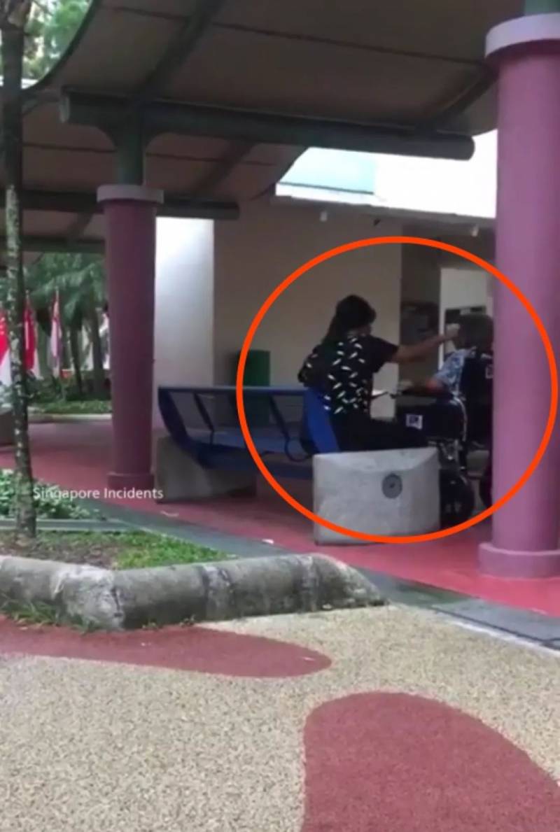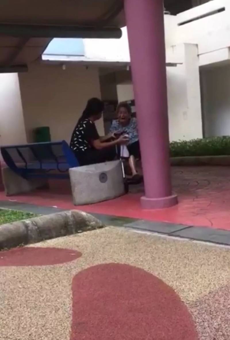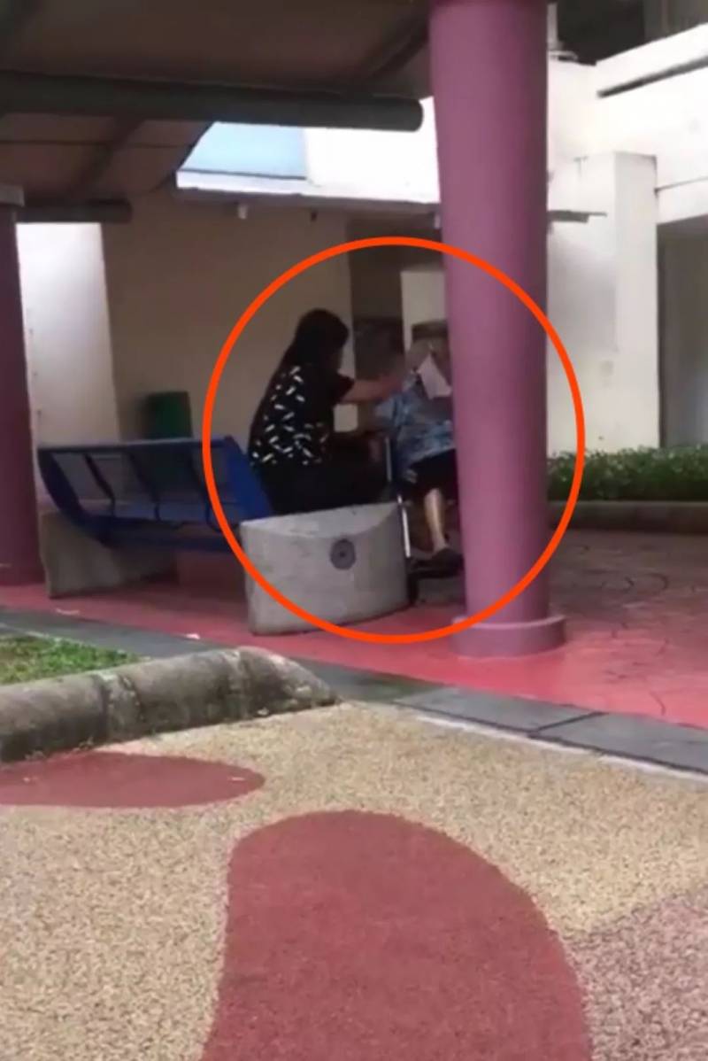视频中,一名女佣似乎在陪着一名坐轮椅的阿嬷在组屋楼下纳凉。过后,阿嬷疑似身体不舒服,突然大叫起来!