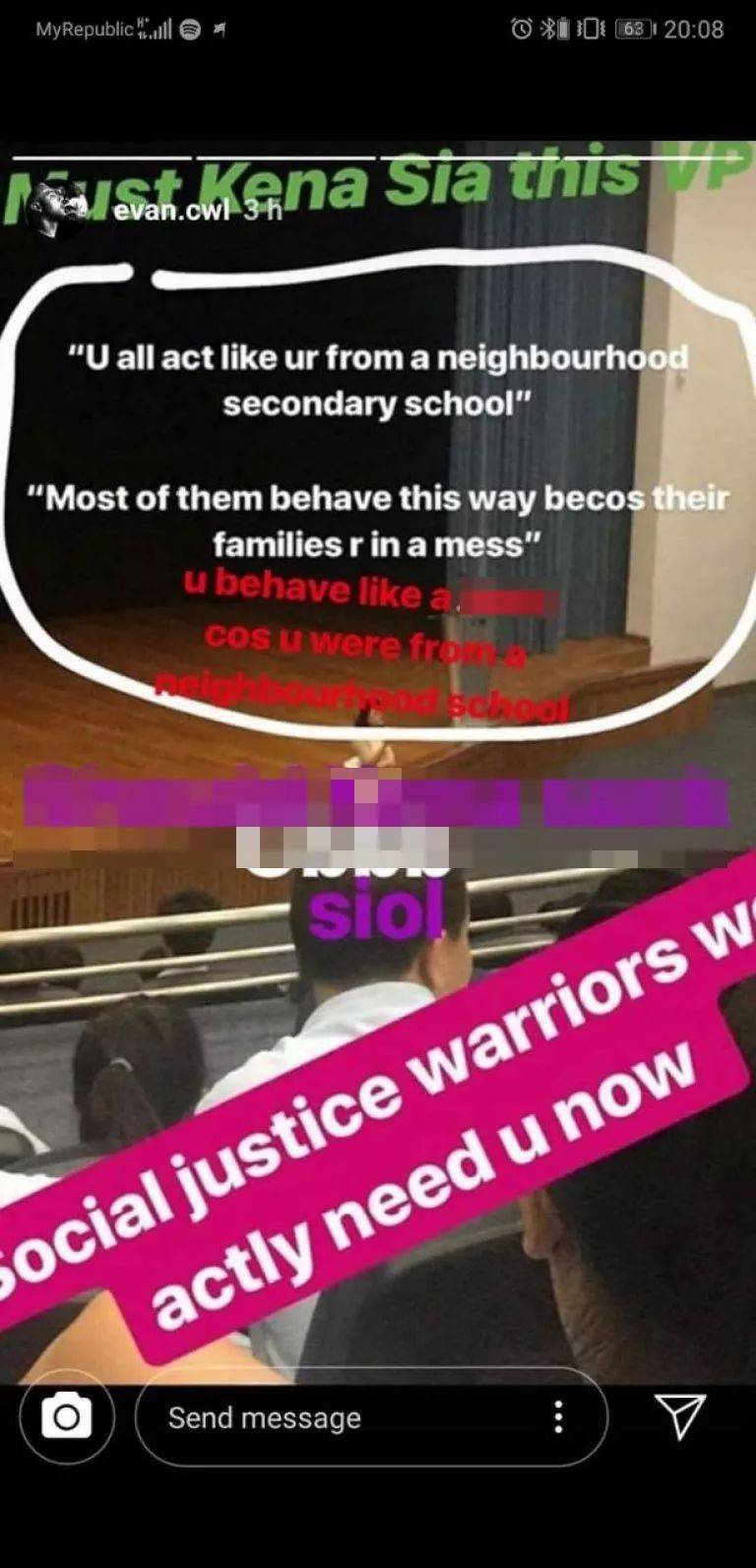 就这样说着说着…… 副校长曾德慧就冒出了一句:公教初级学院不像邻里学校,还说邻里学校大多数的学生都面对家庭问题(U all act like ur from a neighbourhood secondary school. Most of them behave this way because their families are in a mess)。
