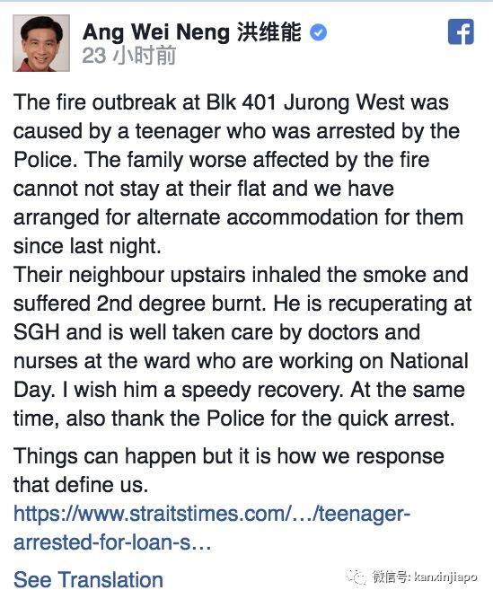 关于这件事,该区议员洪维能在Facebook上也发表了贴文,说明了受影响的家庭无法继续住在原来的单位内,但已经为这家人安排了临时住所。洪维能也关心了受伤的邻居,说明了他的情况并希望他能早日康复。