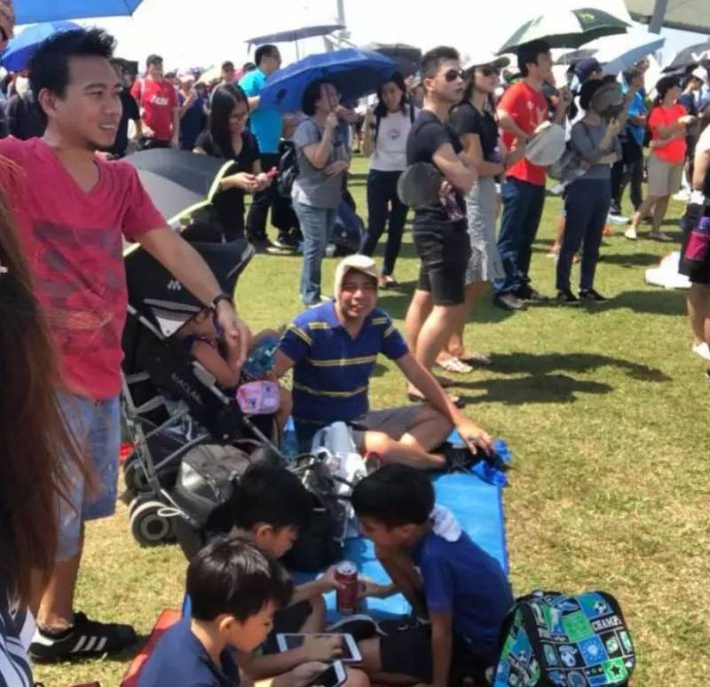 庆祝新加坡空军50周年的活动现场,俨然变成了老少出游,草地野餐胜地。很多父母带着孩子们,铺上小毯子,坐着聊天吃零食看表演。