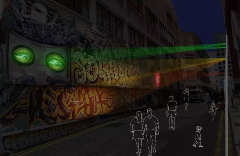 用RGB射灯和集成运动传感器来照明,每一步,运动传感器都会激活聚光灯,照亮涂鸦墙前的物体,创造出戏剧效果和神秘感。