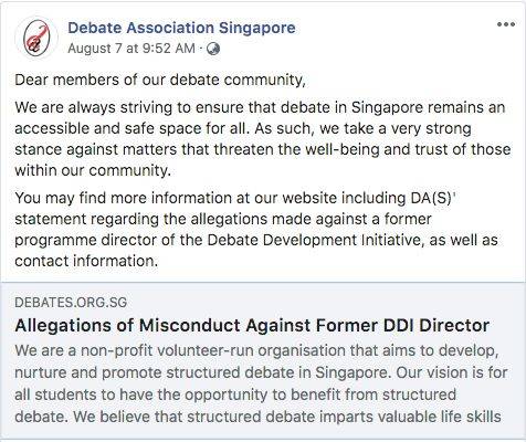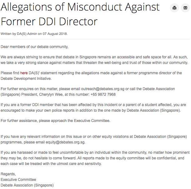 这次,涉嫌骚扰学生的是新加坡辩论协会“辩论发展计划”(Debate Development Initiative)的创办人。