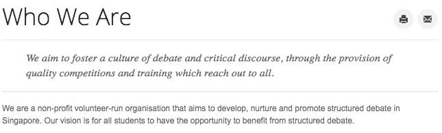 新加坡辩论协会于1999年成立,“是一个非盈利的组织,皆在发展、培养和促进新加坡结构性的辩论。他们的愿景是让所有学生都有机会从结构化辩论中受益。”