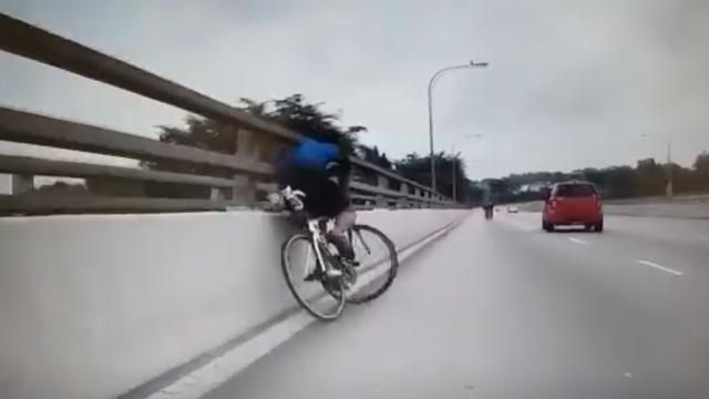 一名脚踏车骑士在高架桥上骑行时,在转换车道的过程中不慎撞上路旁的石墙,摔得“人仰车翻”,视频在网上广传。