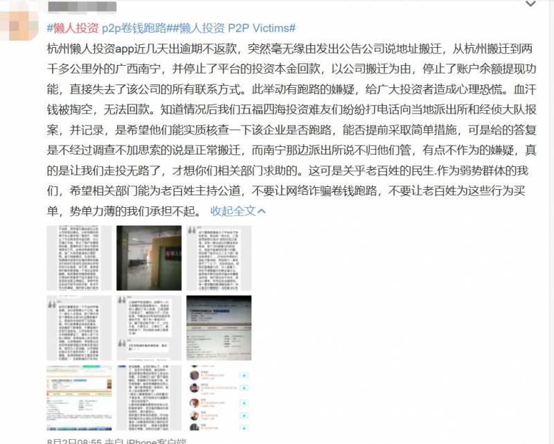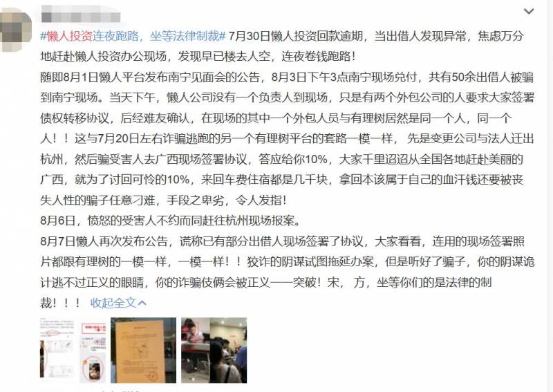 我是7月25日投资的,照理说我在8月11日就可以取出我的第一笔投资的资金。结果没想到懒人投资平台在7月31日就爆雷了,之前我一直不知道,直到8月6日我刷微博才得知此事。