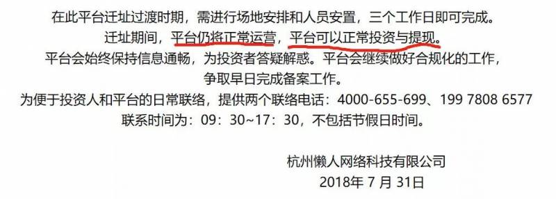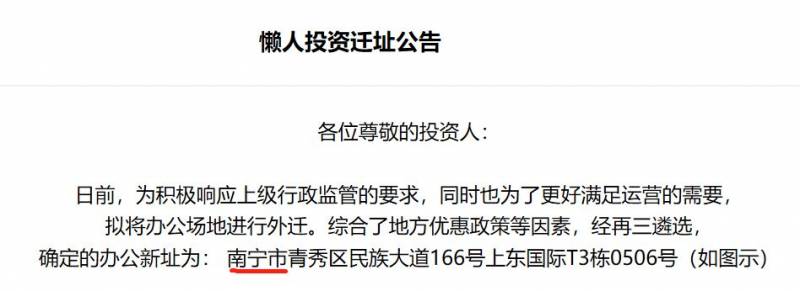 事情是这样的,7月31日,懒人网络科技有限公司发了一则《懒人投资迁址公告》,告诉所有投资人公司将迁移到南宁。