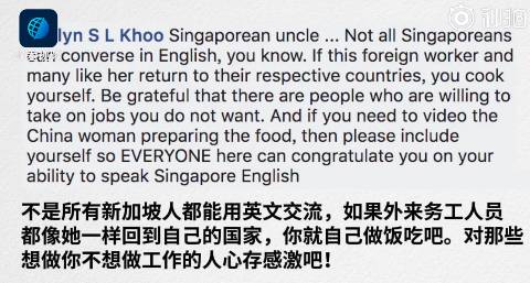 视频|中国女服务生不会讲英文 被新加坡男大骂:滚回中国