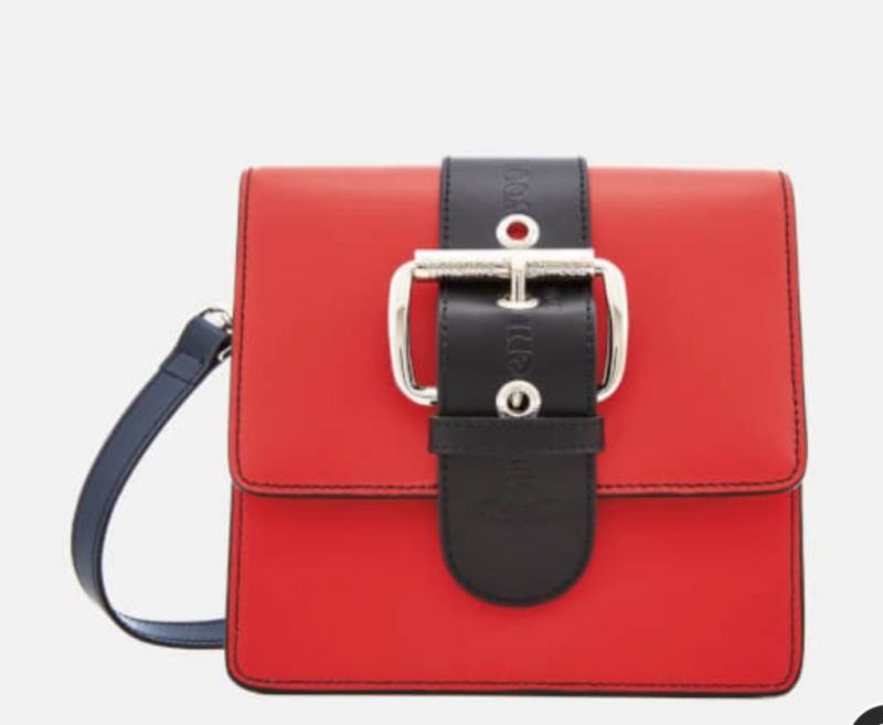红色包面,包包侧面、皮扣以及肩带采用黑色撞色设计