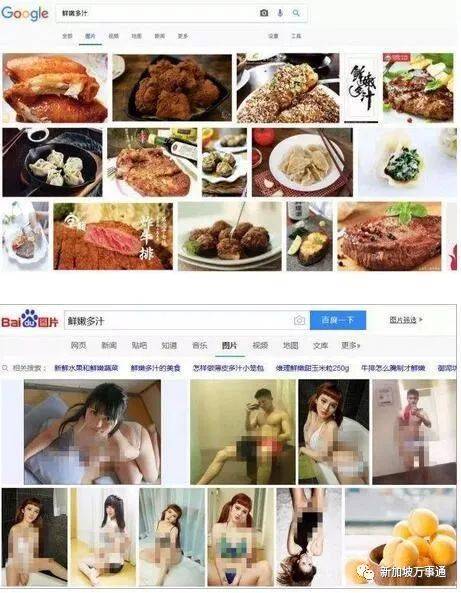 这是中国网友发布在网上的,在Google和百度上分别搜索“鲜嫩多汁”,Google一本正经地给大家展示各种美食的照片,但是百度页面中显示的是各种性感女郎!