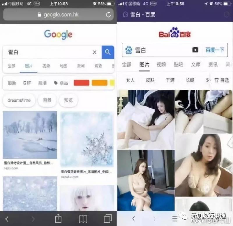 原来在百度和Google输入相同的关键词,搜出来的结果大相径庭。比如,输入“嫩滑”、“鲜嫩”、“女佣”、“三点透视图”等字眼,Google搜索出来的都是食物、女佣照片、设计图等“正经”图片,但是百度搜索结果里,充斥着着装暴露的女性、性感泳装照片等“大尺度”图片。