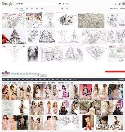 而身在新加坡的万事通,去搜索了“三点透视图”,Google显示的是一大片的学术图片,中间夹杂两个穿内衣的美女,但是在百度搜出来的竟然全篇都是学术图片。