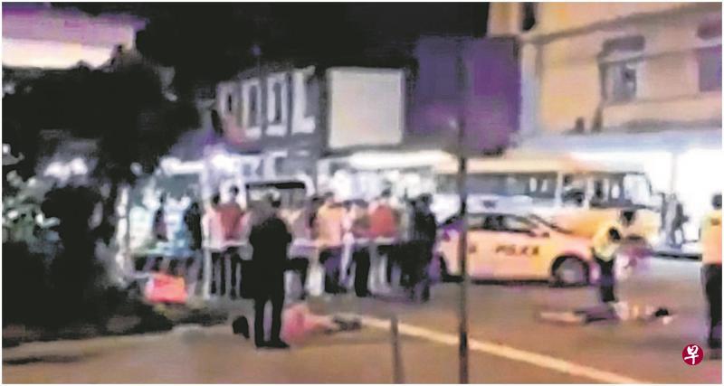 根据面簿今早流传的视频显示,有路人拍下两名伤者浴血倒卧路面的情况,现场至少有一辆警车和一辆救护车,小部分范围也遭封锁。数名警员正在现场维持秩序,旁边则聚集了不少好奇围观的公众。