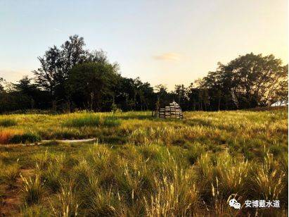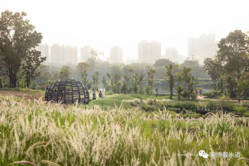 地势高的区域,种植了成片的红毛草和狼尾草,打造一个适合鸟儿筑巢和捕食的环境。项目建成后吸引了大群叽叽喳喳的田鹨出没。鸟巢形状的观鸟亭由场地里回收的雨树做成,人们可以躲在观鸟亭里暗中观察这些吵闹的小鸟。