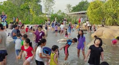 孩子们像蝴蝶一样飘过池塘,像白鹭一样掠过水面,像青蛙一样跃过草丛,像蛇一样从树上游下,像猴子一样爬上藤蔓,像松鼠一样在枝头寻找平衡,像水獭一样挖洞,像螃蟹一样在洞穴里暗中观察。每一种动物都是裕廊湖区常见的,稍加留意就可以在树上、草丛中、溪水里观察到它们。