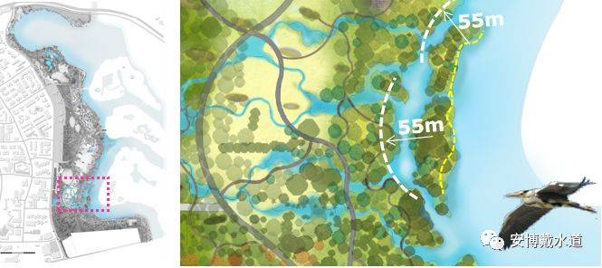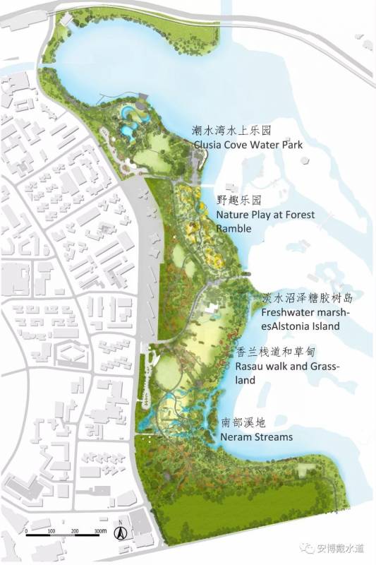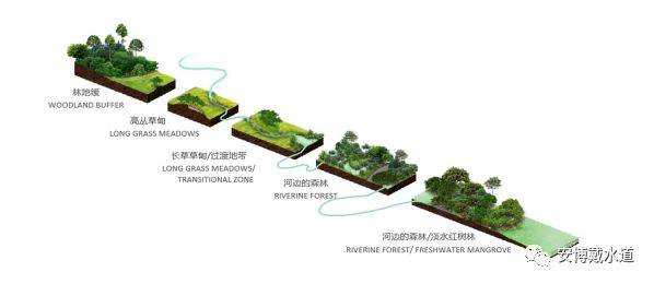 地势低的区域,通过生态改造,沿岸种植了50多种适应潮汐变化的湿地植物,成了香兰草,红椰树,野菠萝丛生的河岸,成了巨蜥和蜻蜓的家园,成了冠斑犀鸟,白鹭和江獭觅食的地方。