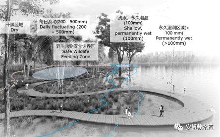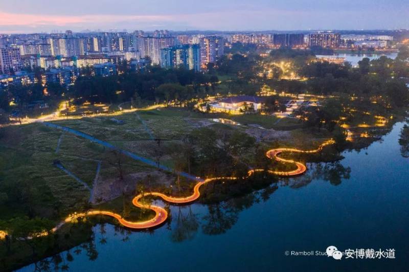 安博戴水道通过有效的生态修复,恢复新加坡裕廊湖畔花园泽国风光,归还水鸟们的旧日家园,同时满足当下市民的生活、学习、健身需求。尊重植物的生境,提高动物栖息地的质量,利用生物净化群落循环净化水体,梳理市民与自然的亲和面,寓教于乐地向年轻一代介绍湿地生物。