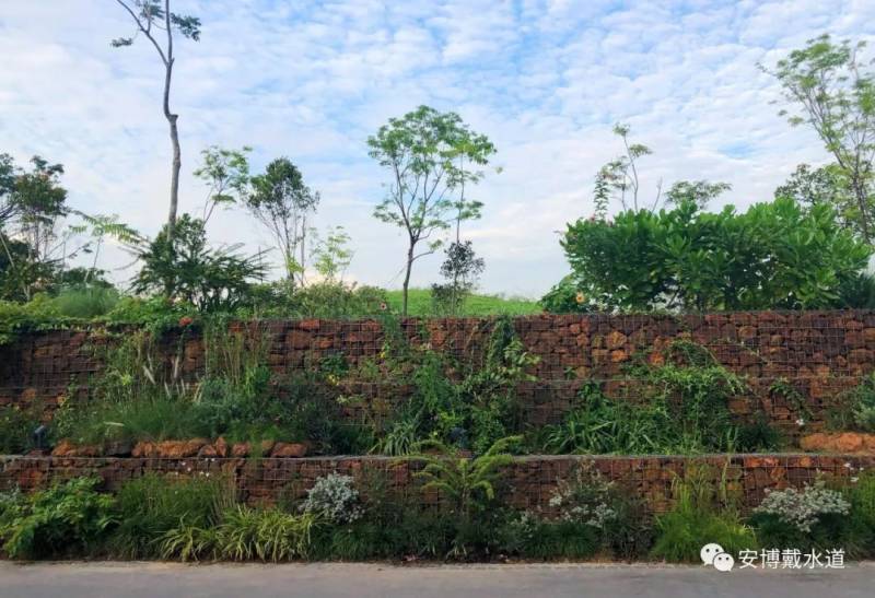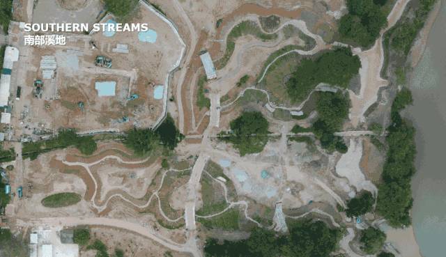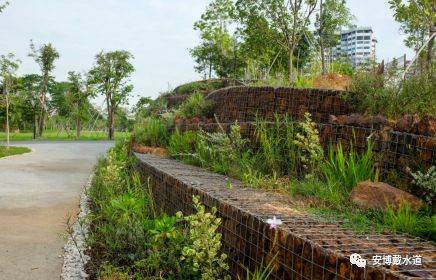 溪岸用生态工法进行加固:石块能降低水速减缓侵蚀,深根性的灌木和地被能稳固基岸,可降解的椰榈织物能在植物的根系成熟前,暂时固定土壤。相较于硬质的混凝土,生态工法能进行够持续的生长与自我修复,对水生生物和两栖类更友好,同时能满足城市排水管道的泄洪需求。
