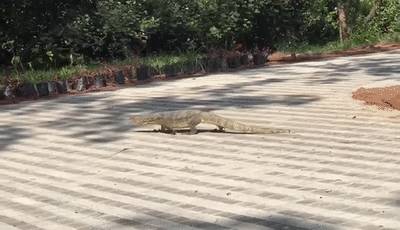 巨蜥在湖中捕鱼,在湿地和溪地寻找青蛙和螃蟹。它们的最爱是南部溪地的抛石护岸,经常一动不动地瘫在石滩上消食。而沥青路面下,连接生态水沟和溪地的石砌排水沟,则成了它们最爱的过马路方式。