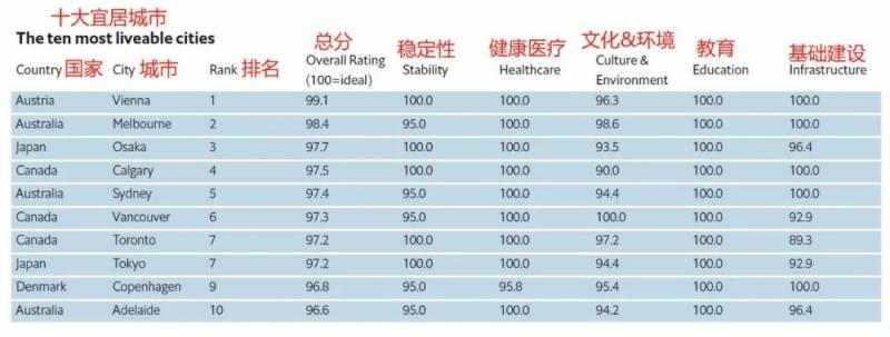 《全球最宜居城市排行榜》为全球140个城市及国家在社会稳定、医疗卫生、文化与环境、教育及基础设施方面进行评分,再排名。