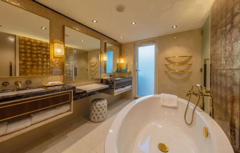 化妆台、衣帽间、迷你吧台、咖啡机等等一个不少;床垫、寝具、清洁用品也都是使用国外知名品牌。
