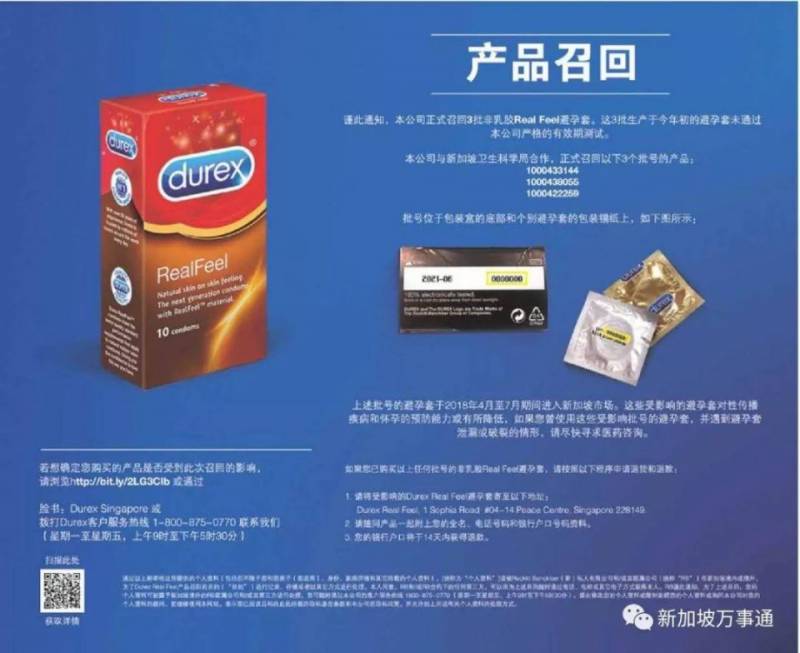 除了新加坡,杜蕾斯此次召回还涉及英国,爱尔兰和马来西亚的同系列产品。