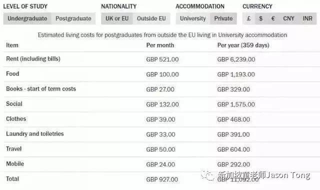 而研究生的生活费为£9165-15061/年