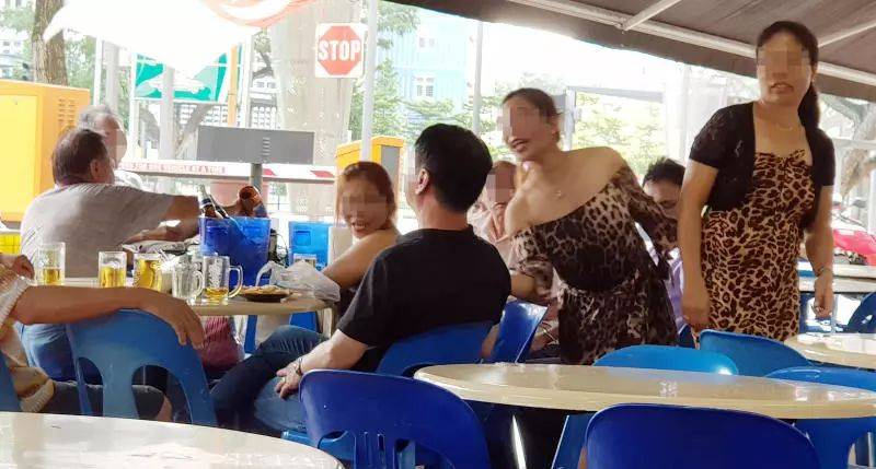 而距离草地不远组屋楼下的咖啡店每逢周末更是会出现“陪酒女佣”,身穿性感低胸装,光天化日下公然与阿叔调情、搂抱。
