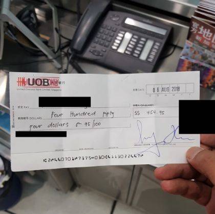 事实上,这张支票并不是大家想像中的“巨额”支票,而是一张价值454.75新币的支票,而且看起来是自新加坡的一所教堂。