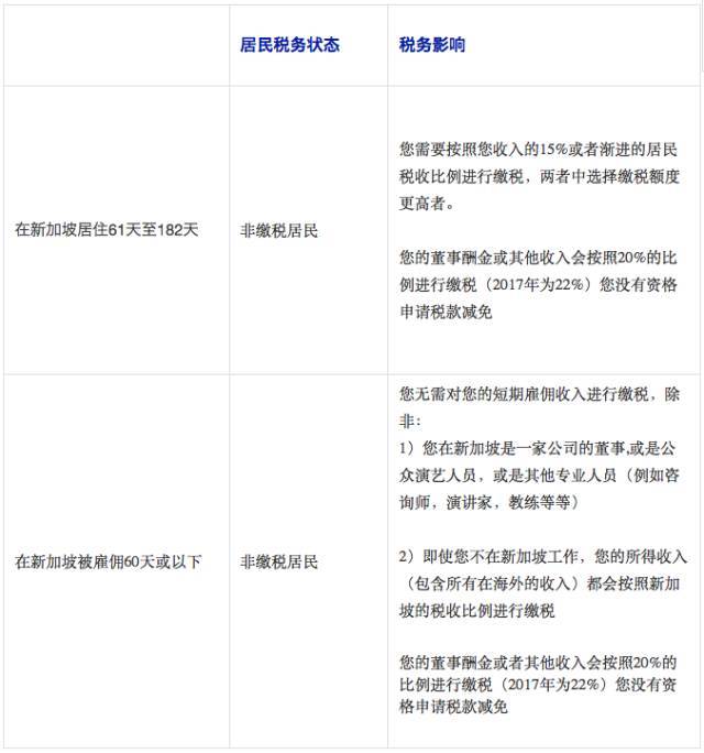 如果非纳税居民在一个公历年度内在新加坡受雇累计不超过60天,可免缴个人所得税,但在新加坡担任董事、演艺人员或者进修实习的非居民个人除外。