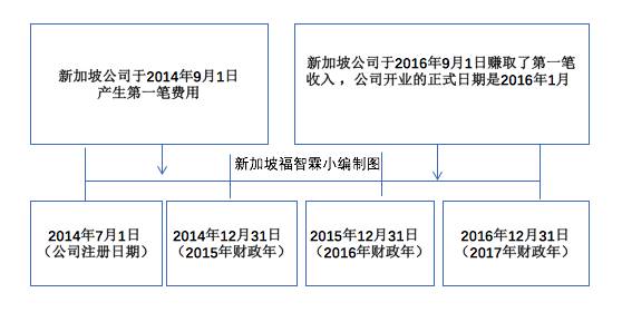 比如一间注册于2014年7月1日的新加坡公司,其财务年结束时间为每年12月。公司在同年9月1日产生第一笔费用,比如支付租金和购买设施等。然后公司于2016年9月1日才赚取第一笔收入。