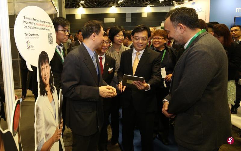 财政部长王瑞杰(右三)和通讯及新闻部兼文化、社区及青年部高级政务部长沈颖(右四),在中华总商会会长黄山忠(右五)陪同下参观中小企业博览会。(邝启聪摄)