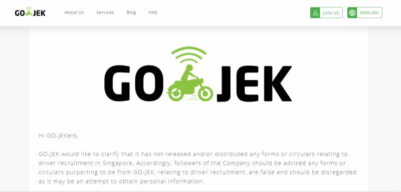 Go-Jek在官方部落格澄清,公司并没有发布或分发在新加坡招聘司机的任何表格或通告,目前在网上流传的相关表格都是假的,呼吁公众不要理会,因那可能是不法之徒企图骗取个人资料的伎俩。